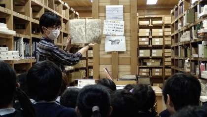 貴重な本が保管されている倉庫を見学しました。江戸時代の本を見せてもらいました。