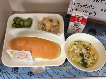 9日(月)の給食は、「中華おこわ」「卵スープ(除去食対応献立)」「きゅうりのピリ辛あえ」「コッペパン」「マーマレード」「牛乳」でした。