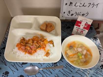11日(水)の給食は、「ケチャップライス」「スープ」「れんこんフライ」「牛乳」でした。