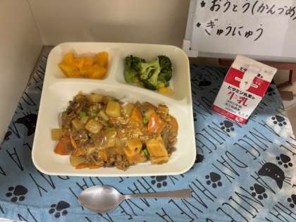 今日の給食は、「冬野菜のカレーライス」「ブロッコリーとコーンのサラダ」「黄桃(缶詰)」「牛乳」でした。