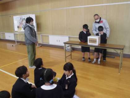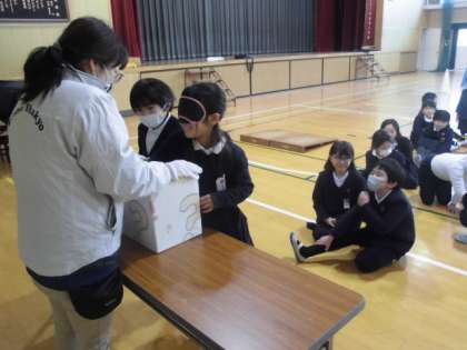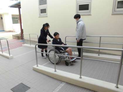 体育館での体験の後は、体育館前のスロープなどを体験しました。実際に乗ることでどのようにしてもらったら安心して乗れるか分かったようでした。その後は、アイマスク体験もしました。
