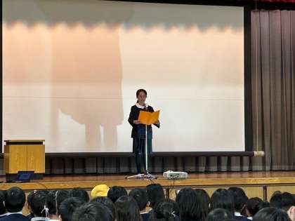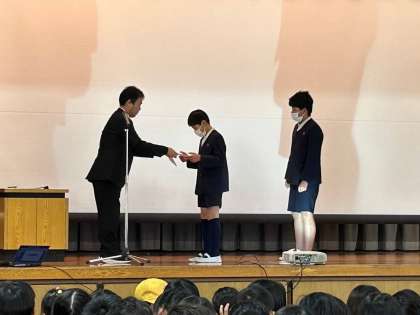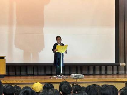 初めに体育施設開放で行われている剣道の表彰がありました。続いて、計算タイムで100点を取った回数が多かった、それぞれの学年の1位と2位の人に表彰をしました。表彰者の名前が発表されると、とても大きな拍手と歓声が上がりました。その後は、3,4年生の代表から2学期頑張ったことについて作文の発表がありました。頑張ったことを自信を持って堂々と発表してくれました。