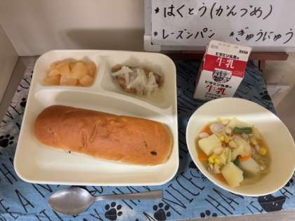 今日の給食は、「あじのレモンマリネ」「てぼ豆のスープ煮」「白桃(缶詰)」「レーズンパン」「牛乳」です。