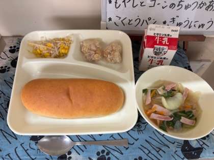 今日の給食は、「鶏肉のからあげ」「ハムと野菜の中華スープ」「もやしとコーンの中華あえ」「黒糖パン」「牛乳」でした。