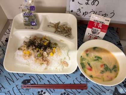 今日の給食は、「れんこんのちらしずし」「きざみのり」「ぞう煮」「ごまめ」「牛乳」でした。
