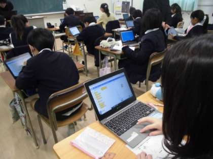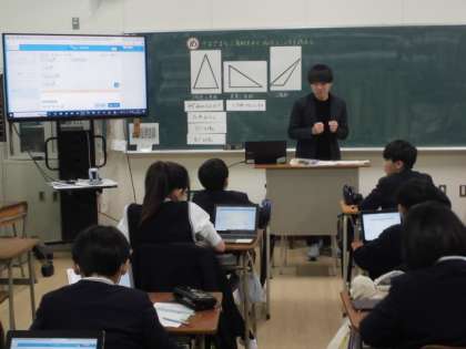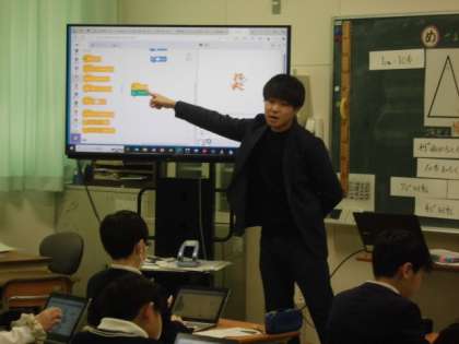 5年生が、算数で「正多角形と円」の学習をしました。二等辺三角形や直角三角形をプログラミングで描くために、「スカイメニュー」の「気づきメモ」で友だちと考え方を共有しながら考えました。その後、「スクラッチ」を使って描きました。なかなか思い通りに描けませんでしたが、みんな粘り強く学習することができました。