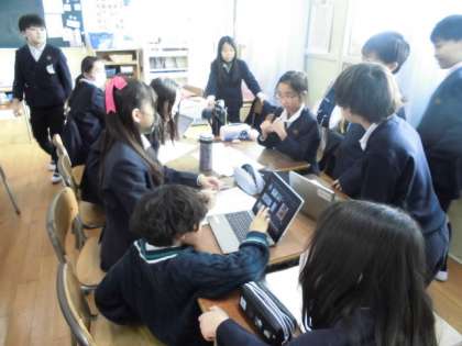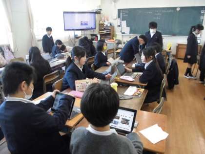 4年生が、10年後の同窓会でみんなが再会するまでに行っておきたい都道府県について調べています。調べたことをもとに学習発表会で発表します。インターネットなどを使って調べて、班ごとに話し合っていました。