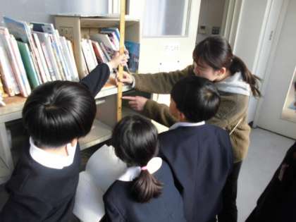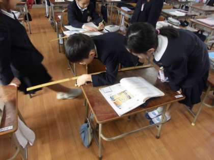 2年生が、算数で「長い長さをはかろう」の学習をしました。1mものさしでいろいろなものの長さを図りました。ペアで協力して楽しく学習しました。