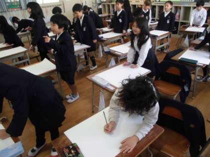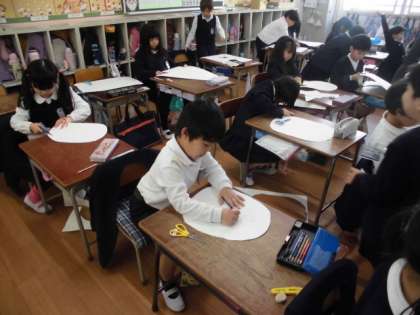 1年生が、図工で紙版画の学習をしました。自分の顔の版画に挑戦します。まずは、画用紙で顔の輪郭を作ってはさみで切りました。みんな自分の顔の形をそれぞれにイメージしながら作っていました。