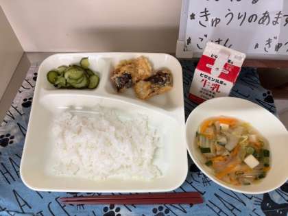 24日(金)の給食は、「さばのカレーたつたあげ」「五目汁」「きゅうりの甘酢あえ」「ごはん」「牛乳」でした。