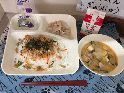 1日(月)は、「鶏ごぼうご飯」「きざみのり」「みそ汁」「焼きれんこん」「牛乳」でした。