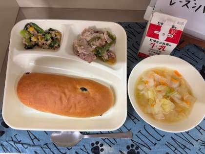 今日の給食は、「豚肉のオイスターソース焼き」「中華スープ」「ツナとチンゲンサイのいためもの」「レーズンパン」「牛乳」でした。