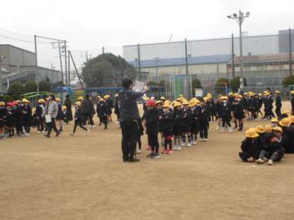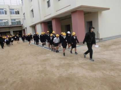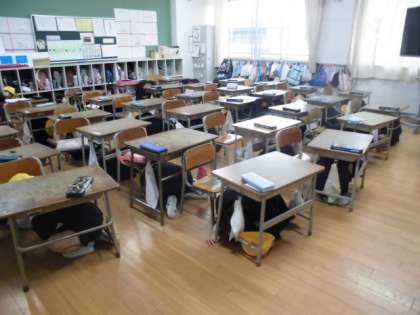 地震が起こった後、津波が発生した場合を想定した避難訓練を行いました。まずは、自分の体を守るため机の下に避難しました。そして、放送の合図を聞いて運動場に避難しました。