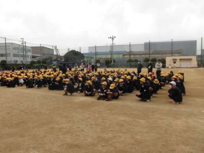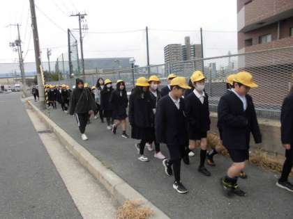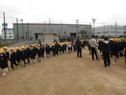 続いて津波の避難訓練を行いました。南海トラフ大地震を想定して、学校の横にあるキングマンションの4階以上に避難しました。速やかに非難することができました。