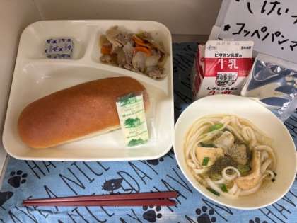 12日(水)の給食は、「豚肉とごぼうの煮もの」「なにわうどん」「とろろこんぶ」「固形チーズ」「コッペパン」「ソフトマーガリン」「牛乳」でした。