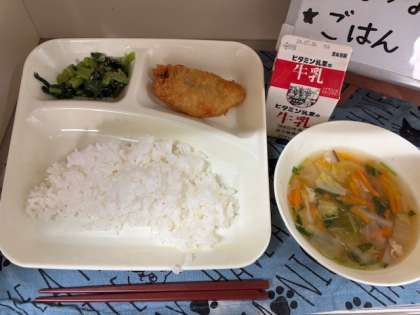 今日の給食は、「たらフライ」「うすくず汁」「こまつなのごまあえ」「ごはん」「牛乳」でした。