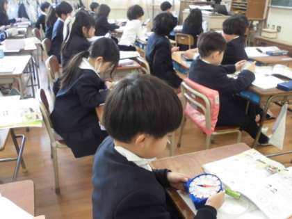 1年生が算数で時計の学習に取り組んでいます。一人一人が学習用の時計で確認しながら時計の読み方について学習しています