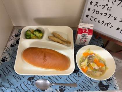 今日の給食は、「わかさぎフライ」「スープ煮」「ブロッコリーとコーンのサラダ」「黒糖パン」「牛乳」でした。