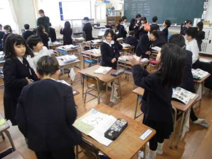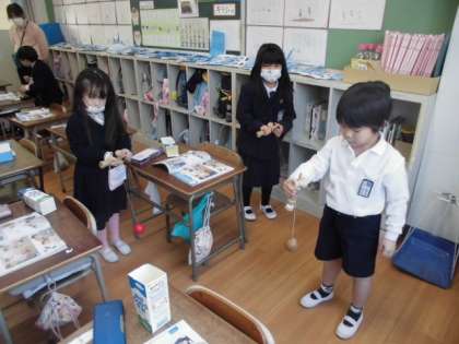 1年生は昔遊びで、お手玉や竹とんぼ、けん玉などにも挑戦しました。なかなかうまくいきませんが、お互いアドバイスしながら少しずつ上手くできるようになってきました。