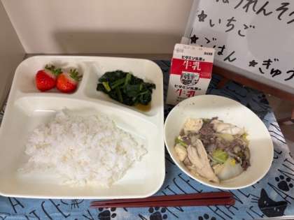 今日の給食は、「すき焼き煮」「ほうれんそうのおひたし」「いちご」「ごはん」「牛乳」でした。