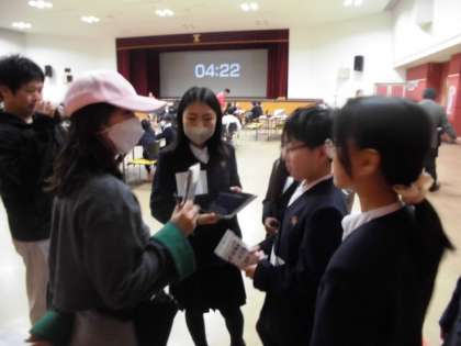 すべての班が制限時間にすべてのミッションをクリアすることができました。緊急事態に正しい情報を得ることがとても大切なことにみんな気づいたようです。一番にクリアした班は、ボールペンをプレゼントされました。