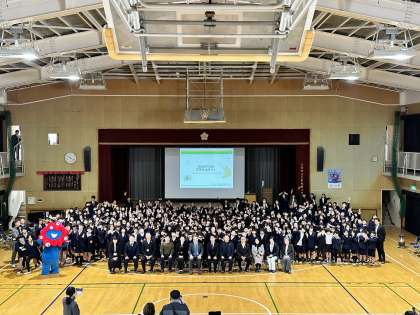 次に写真撮影を行いました。なんとミャクミャクが登場しました。みんな大喜びでした。