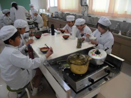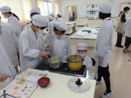 5年生が、調理実習でご飯とみそ汁を作りました。班ごとに協力して手際よく作ることができました。