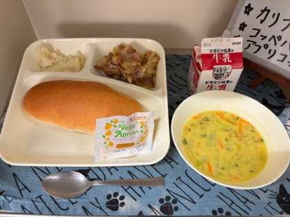 27日(木)の給食は、「豚肉のカレー風味焼き」「コーンスープ」「カリフラワーのピクルス」「コッペパン」「アプリコットジャム」「牛乳」でした。