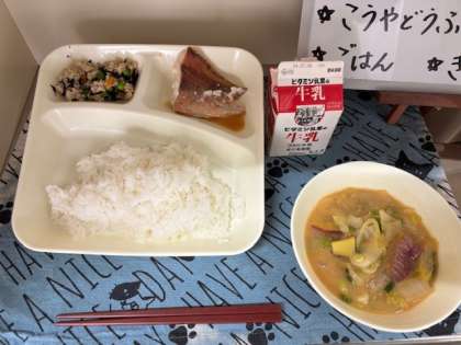 28日(金)の給食は、「あかうおのレモンじょうゆかけ」「さつまいものみそ汁」「高野どうふのいり煮」「ごはん」「牛乳」でした。