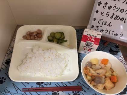 4日(火)の給食は、「関東煮」「きゅうりの梅風味」「とら豆の煮もの」「ごはん」「牛乳」でした。