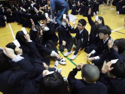 初めに、NGワードゲームをしました。行事や給食をテーマに思い出を振り返りながらゲームをしました。ゲームを楽しみながら思い出を振り返ることができました。