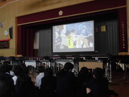 みんなで1年間の思い出を振り返りながら、「思い出ムービー」を観ました。6年生が学校を引っ張って活躍する姿がたくさんありました。たてわり班ごとの写真やいろいろな人からのメッセージもあり、みんな笑顔で観ていました。