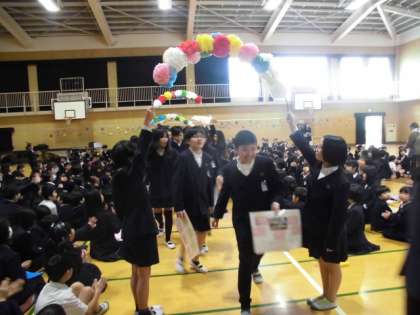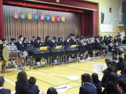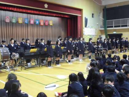 5年生の合奏の後は、6年生から「キセキ」の合奏が披露されました。在校生は、6年生の素晴らしい演奏に聞き入っていました。最後に6年生は、在校生に見送られながら花飾りのアーチを通って退場していきました。、