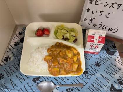 今日の給食は、「チキンカレーライス」「ビーンズサラダ」「いちご」「牛乳」でした。「ビーンズサラダ」は、キャベツと金時豆、えだまめを使ったサラダでした。金時豆が苦手な児童も、少しはがんばって食べようとしている様子が見られました。
