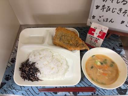 今日の給食は、「いわしフライ」「みそ汁」「牛ひじきそぼろ」「ごはん」「牛乳」でした。