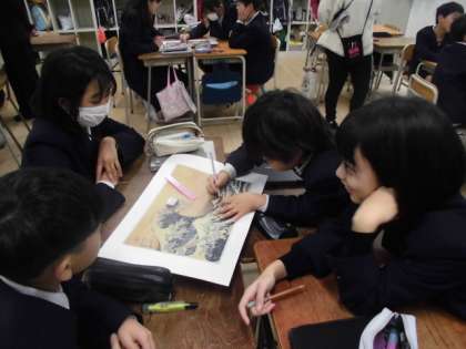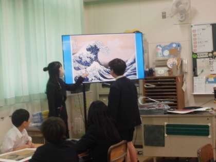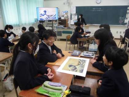 5年生が、図画工作で「神奈川沖波裏」の鑑賞をしました。まずは絵の中の頂点を見つけ、そこから形を見出しました。グループごとにとても熱心に取り組んでいました。