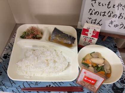 今日の給食は、「さごしのおろしじょうゆかけ」「さといもと野菜の含め煮」「なのはなのおひたし」「かつおぶし」「ごはん」「牛乳」でした。