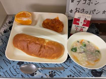 今日の給食は、「えびのチリソースいため」「中華がゆ」「デコポン」「おさつパン」「牛乳」でした。