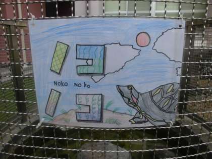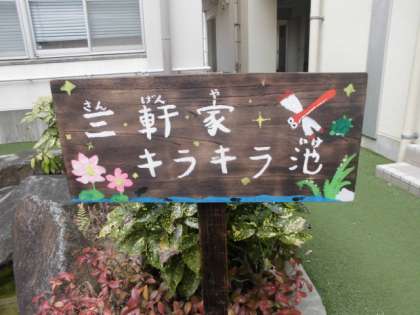 環境委員会が作った、三軒家キラキラ池とカメのノコノコの名前の看板が設置されました。クロメダカも元気に泳いでいます。