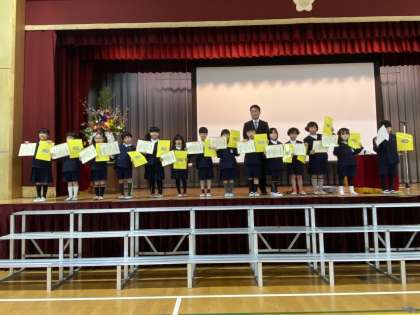 はじめに、漢字検定の満点合格賞や努力賞、優秀賞と計算タイムの満点最多賞の表彰がありました。低学年は、たくさんの満点合格賞がありました。高学年になると難しくなり、満点はなかなか取れませんが、たくさんの人が合格をすることができました。計算タイムも毎週コツコツとがんばることができました。児童代表の思い出作文は、1年生と2年生でした。3学期を振り返ったことやこれから頑張りたいことをしっかりと発表することができました。