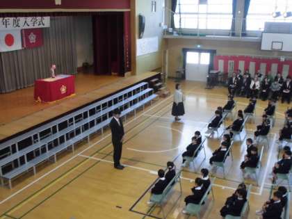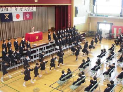 桜も満開の中、令和7年度入学式を行いました。今年の1年生は62名です。校長先生の話であいさつの練習をしたときは、とても大きな声で返事をすることができました。素晴らしい1年生です。2年生の歓迎の言葉も素晴らしく、合唱や合奏の他にもダンスや昔遊びを見せてくれました。1年生は、とても集中して2年生の発表を観ていました。