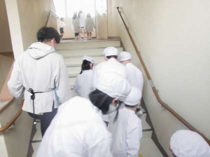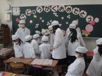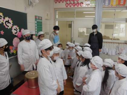 1年生の給食当番を6年生が手伝っています。1年生は、食器や牛乳、大おかずなど重いものを6年生に手助けしてもらいながら運びました。終わった後は、みんなで6年生にお礼を言いました。