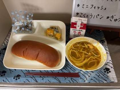 今日の給食は、「カレースープスパゲッティ」「かぼちゃのマリネ焼き」「ミニフィッシュ」「黒糖パン」「牛乳」でした。