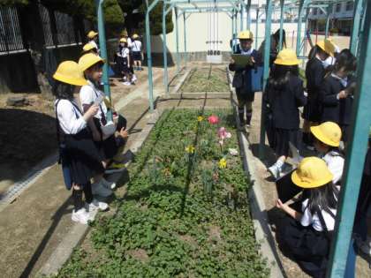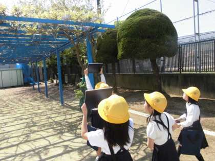 3年生がタブレットをもって運動場へ行き、いろいろな生き物や植物の観察をしました。正門のサクラや三軒家キラキラ池のクロメダカ、タニシ、学習園のチューリップや藤棚のフジ等どんどんタブレットで撮影していました。
