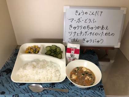 16日(水)の給食は、「マーボーどうふ」「きゅうりの中華あえ」「ツナとチンゲンサイのいためもの」「ごはん」「牛乳」でした。