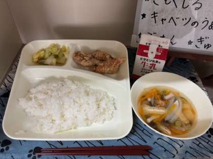 今日の給食は、「鶏肉のたつたあげ」「五目汁」「キャベツの梅風味」「ごはん」「牛乳」でした。