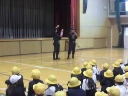 給食室からの火災を想定した避難訓練を行いました。雨が降っていたので、講堂に避難しました。「おはし」おさない はしらない じゃべらない をしっかり守って真剣に訓練をすることができました。消防署の方からは、消火器の使い方の説明がありました。この説明もとても集中して聞くことができました。