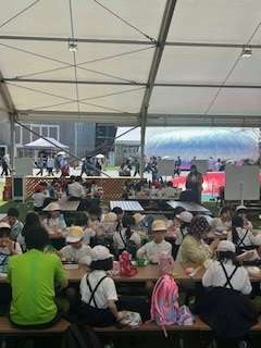 お昼ごはんタイムです。屋根付きの団体休憩場所でお弁当を食べました。