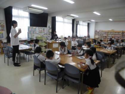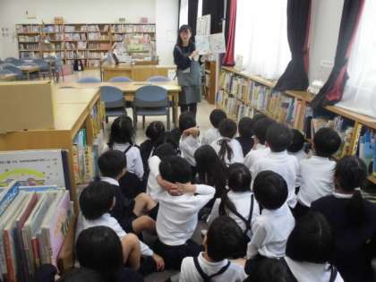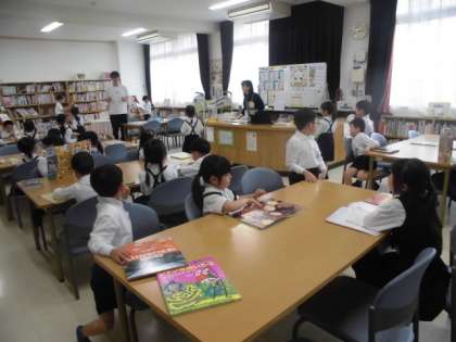 1年生が図書室で読書をしています。毎週金曜日は、学校司書の先生も図書室にいます。読み聞かせもしてもらいました。みんな楽しく本を読んでいました。