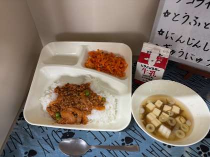 今日の給食は、「タコライス」「とうふともずくのとろり汁」「にんじんしりしり風」「牛乳」でした。